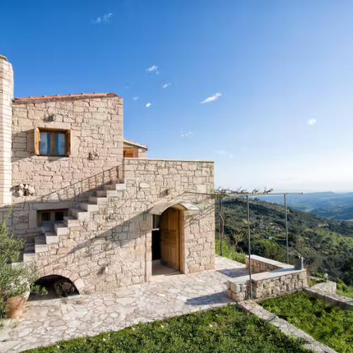 - Built with local Cretan stones to blend with the natural environment, the house spans 110 square meters and features two interconnected floors.