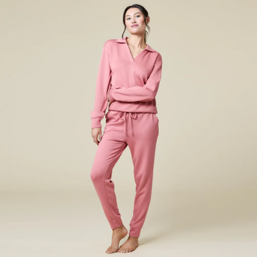 Let’s talk about one travel outfit you’ll actually want to wear on long flights, the DreamTech Johnny Collar Lounge Set from Softies. This isn’t your average flight outfit; it’s the kind of set that feels like grown-up pajamas but looks way more stylish than your typical airport lounge wear. First off, the fabric is seriously dreamy. Made with Softies’ signature DreamTech material, a super soft blend that has just the right amount of stretch. This set feels cozy without feeling heavy or bulky. That means no stiff seams digging into you after hours in your seat, and no scratchy fibers making you fidget.